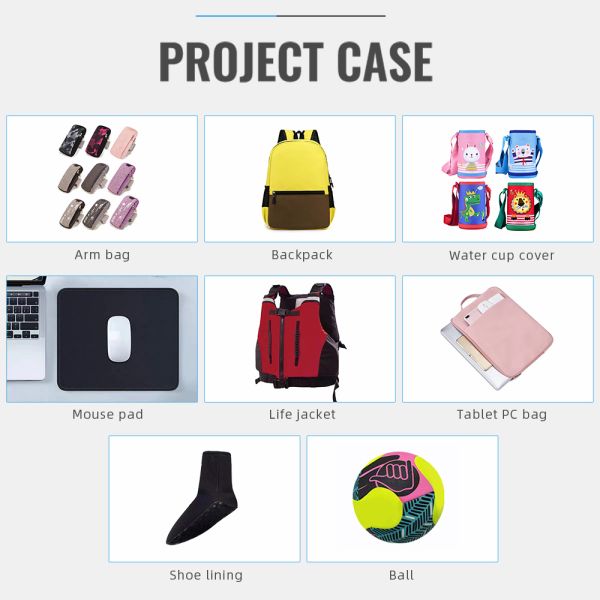 bags, shoe materials, sports protective gear, fishing shoes, mouse pads, swimsuits, etc. |