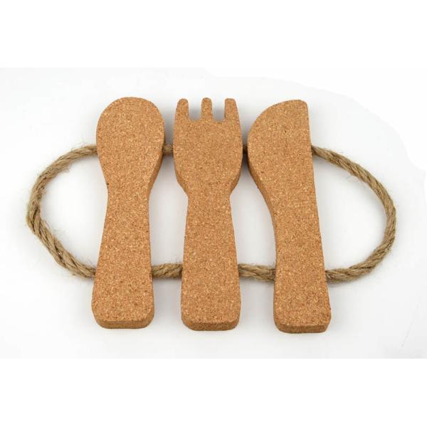 This cork trivet with rope handle is the great way to protect your tables and all surfaces from hot pot, pan and dish in your kitchen and dining area. Depending on the design, 3 cork figures in the form of cutlery were cut and strung on a rope. It is particularly thick and has a rope to hang on both sides. The cutleries can still be pulled apart to increase the footprint. Cork trivet is non-slip, natural, healthy, non-toxic, heat insulated, durability, eco-friendly and designed to protect your surfaces. The trivet is naturally resistant to liquids and easy to clean. Perfect for daily use. Made of natural fine grain cork, this trivet is a necessary part of the kitchen and dining collection for the eco-conscious! These cork trivets can be easily stored away in any drawer or hung on the wall. A wanderful gift idea for kitchen lovers. This product is not only functional but also decorative due to the natural characteristics of cork which is sustainable source. Serve your food in style with our Cork Trivets. We can supply various shapes and sizes for your any requirement.